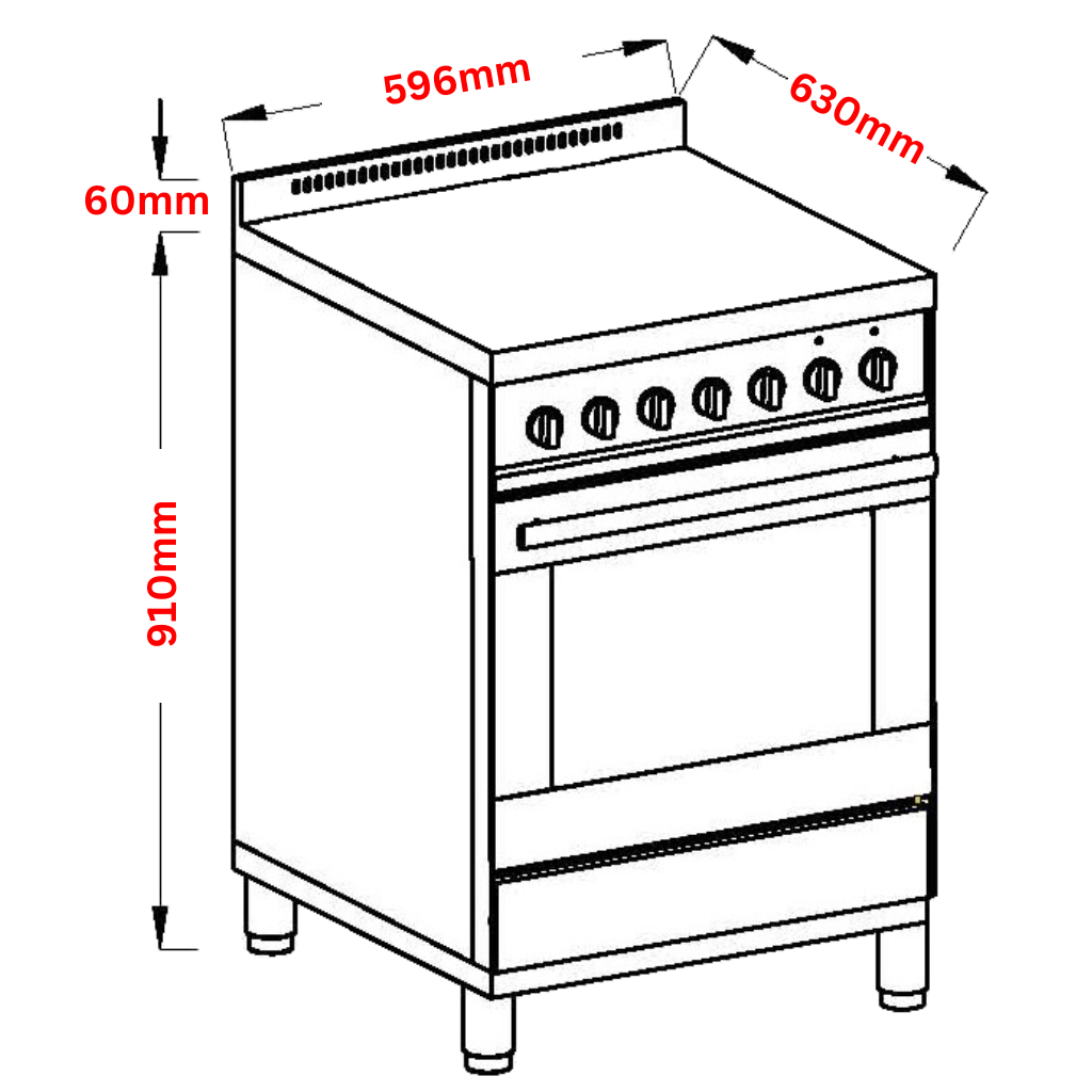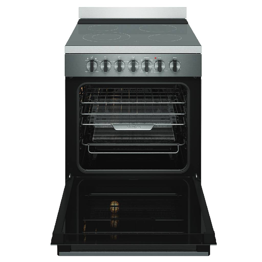 60cm dark stainless steel electric freestanding oven with multi-function 7 fan forced oven with AirFry, 120 minute timer with ringer, 4 zone ceramic cooktop with dual zone and hot surface indicator.